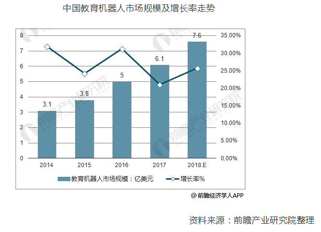 據(jù)前瞻產(chǎn)業(yè)研究院發(fā)布的《中國教育機(jī)器人行業(yè)發(fā)展前景預(yù)測(cè)與投資規(guī)劃分析報(bào)告》數(shù)據(jù)顯示,2017年中國教育機(jī)器人市場(chǎng)規(guī)模為6.1億元,同比增長(zhǎng)21.1%,隨著國家政策大力扶持人工智能中小學(xué)落地,預(yù)計(jì)中國教育機(jī)器人市場(chǎng)將持續(xù)穩(wěn)定增長(zhǎng),預(yù)計(jì)2018年中國教育機(jī)器人市場(chǎng)規(guī)模將達(dá)到7.6億元,增長(zhǎng)率為25.8%。
