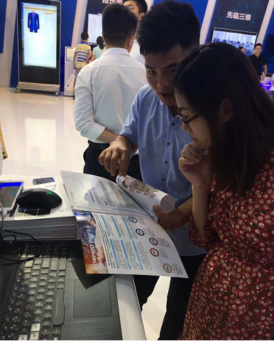 觀眾在智博會現(xiàn)場體驗服裝行業(yè)的“一分鐘換裝技術”