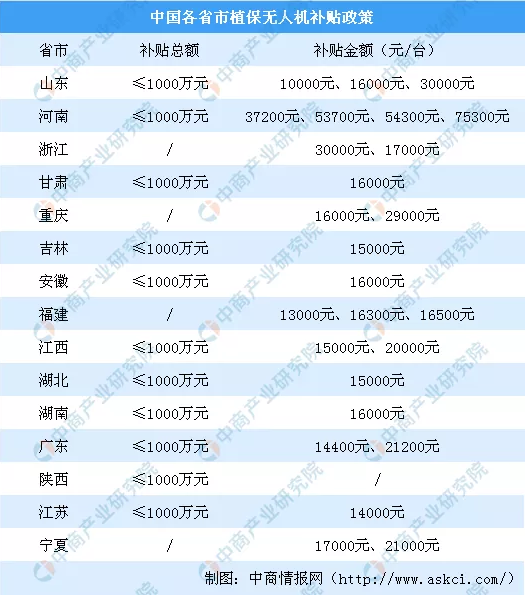 目前,進(jìn)入補(bǔ)貼試點(diǎn)的省市已有浙江、安徽、江西、湖南、廣東、重慶、吉林、福建、甘肅、江蘇等十余個(gè)省市。在整體試點(diǎn)資金安排上,基本為千萬(wàn)元量級(jí)。政策支持下植保無(wú)人機(jī)市場(chǎng)在全國(guó)就進(jìn)入快速發(fā)展期。