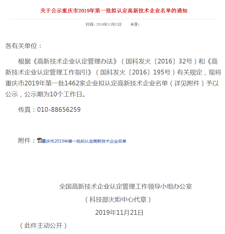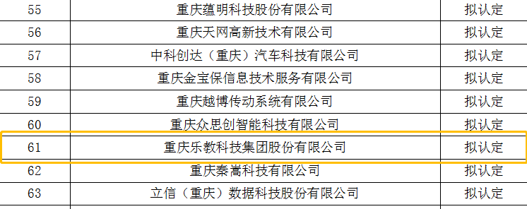 全國高新技術(shù)企業(yè)認(rèn)定管理中心根據(jù)《高新技術(shù)企業(yè)認(rèn)定管理辦法》(國科發(fā)火〔2016〕32號)和《高新技術(shù)企業(yè)認(rèn)定管理工作指引》(國科發(fā)火〔2016〕195號)有關(guān)規(guī)定,公示了重慶市2019年第一批1462家企業(yè)擬認(rèn)定高新技術(shù)企業(yè)名單,重慶樂教科技集團(tuán)股份有限公司入選。