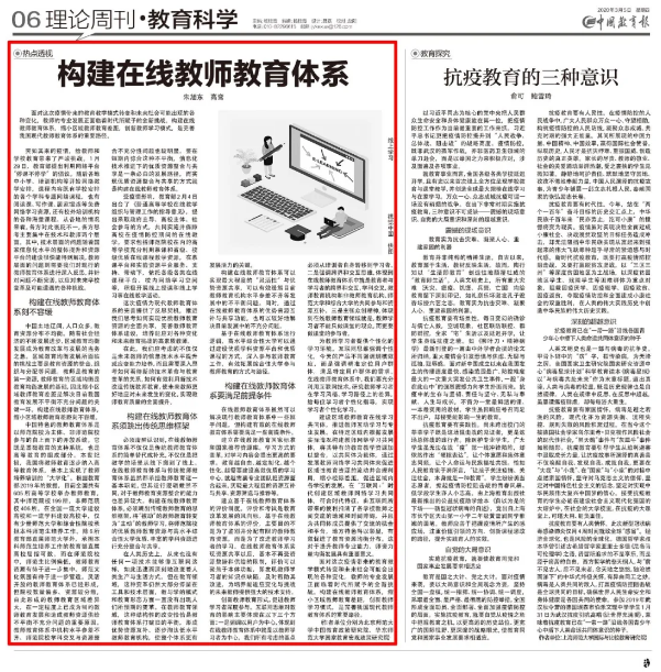 中國(guó)教育政策研究院常務(wù)副院長(zhǎng)朱旭東、國(guó)家教育宏觀政策研究院副研究員高鸞撰寫(xiě)了《構(gòu)建在線教師教育體系》一文,闡述了我國(guó)構(gòu)建在線教師教育體系的必要性、緊迫性,在線教師教育體系與傳統(tǒng)教師教育體系的差異以及構(gòu)建思路。文章刊發(fā)于《中國(guó)教育報(bào)》(2020年3月5日06版)