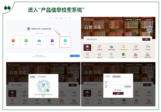 輸入網(wǎng)址http://xuanshu.hep.com.cn/,進(jìn)入“產(chǎn)品信息檢索系統(tǒng)”首頁(yè),點(diǎn)擊右側(cè)“電子書”模塊,進(jìn)入電子書界面,點(diǎn)擊右上角“登錄/注冊(cè)”按鈕,選擇“掃碼登錄”或“手機(jī)驗(yàn)證碼登錄”。①“掃碼登錄”操作步驟:通過(guò)微信“掃一掃”掃描頁(yè)面上的小程序碼,新用戶登錄請(qǐng)點(diǎn)擊微信界面“微信授權(quán)”→“允許”高教社用戶中心申請(qǐng)→“授權(quán)使用手機(jī)號(hào)”→“允許”高教社用戶中心使用→“確認(rèn)登錄”;老用戶直接點(diǎn)擊微信界面的“確認(rèn)登錄”。